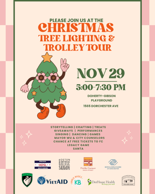 Join the Fields Corner community for a Christmas Tree Lighting & Trolley Tour! This night filled with fun will include storytelling, crafting, treats, giveaways, performances, singing, dancing, and games. There will be special appearances by Mayor Wu, Boston City Councilors, and Santa Claus himself!